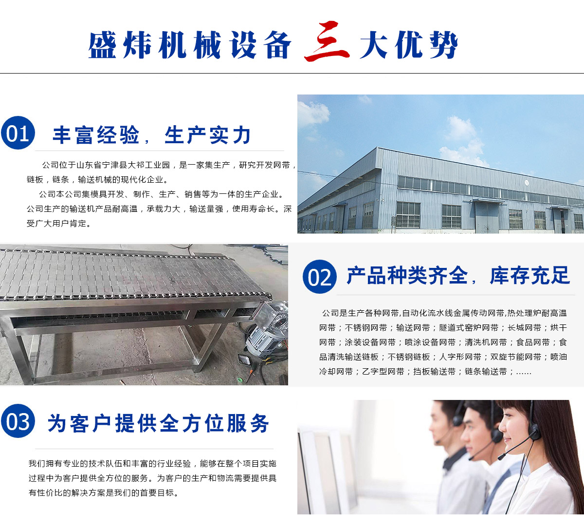 寧津盛煒機械設備有限公司位于山東省寧津縣大祁工業園。公司是一家集生產、研究開發網帶、鏈板、鏈條、輸送機械的企業,本公司集模具開發、制作、生產、銷售等 生產型企業。公司所生產的輸送機等產品具有耐高溫,承載力大,輸送量強,使用壽命長等特點。深受廣大用戶的肯定【更多簡介】